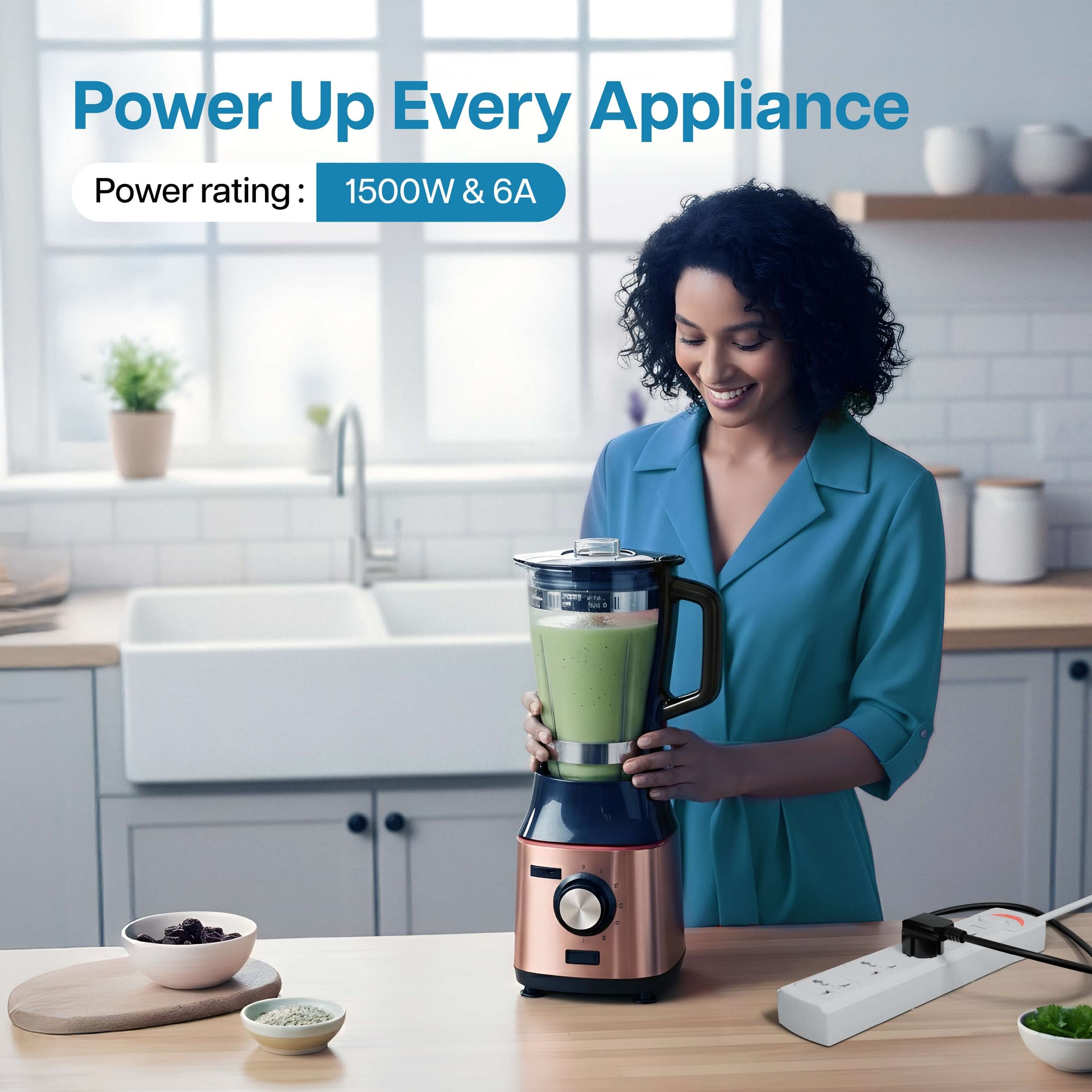 4 Universal Sockets with on Off Button, 3mtr Long Copper Cable, 1500 Watts, 6 Amp