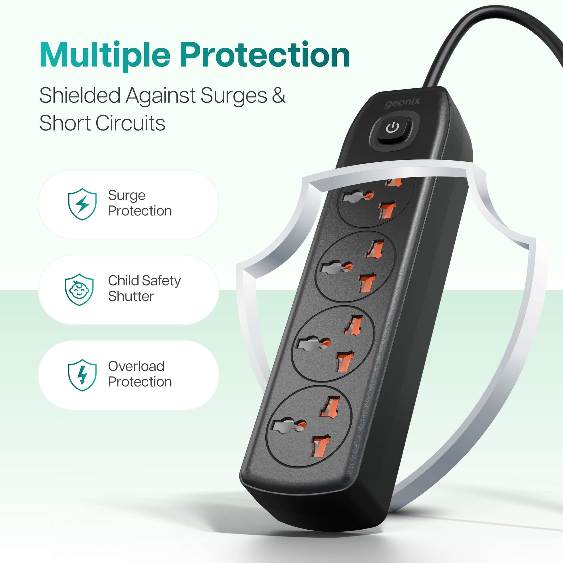 Geonix PowerSpan S4 Pro Extension Board is a high-performance power solution built for modern homes, offices, and commercial spaces. Featuring 4 universal sockets compatible with all major plug types (EU, US, UK, and more) and a master on/off button, it offers effortless one-touch control for multiple devices such as laptops, TVs, routers, desktops, and entertainment systems. With a robust 2500W power capacity and 10A output, the PowerSpan S4 Pro ensures safe, stable, and efficient power distribution for high-load appliances. The 3-meter heavy-duty cable made from 100% pure copper delivers excellent conductivity and extended reach, making it ideal for larger rooms and workspaces. Encased in a premium fire-resistant ABS body, it provides enhanced protection against overheating, short circuits, and voltage fluctuations. Finished in a sleek black design, this versatile extension board blends seamlessly with modern interiors and is perfect for desktops, kitchen counters, workstations, and professional setups.