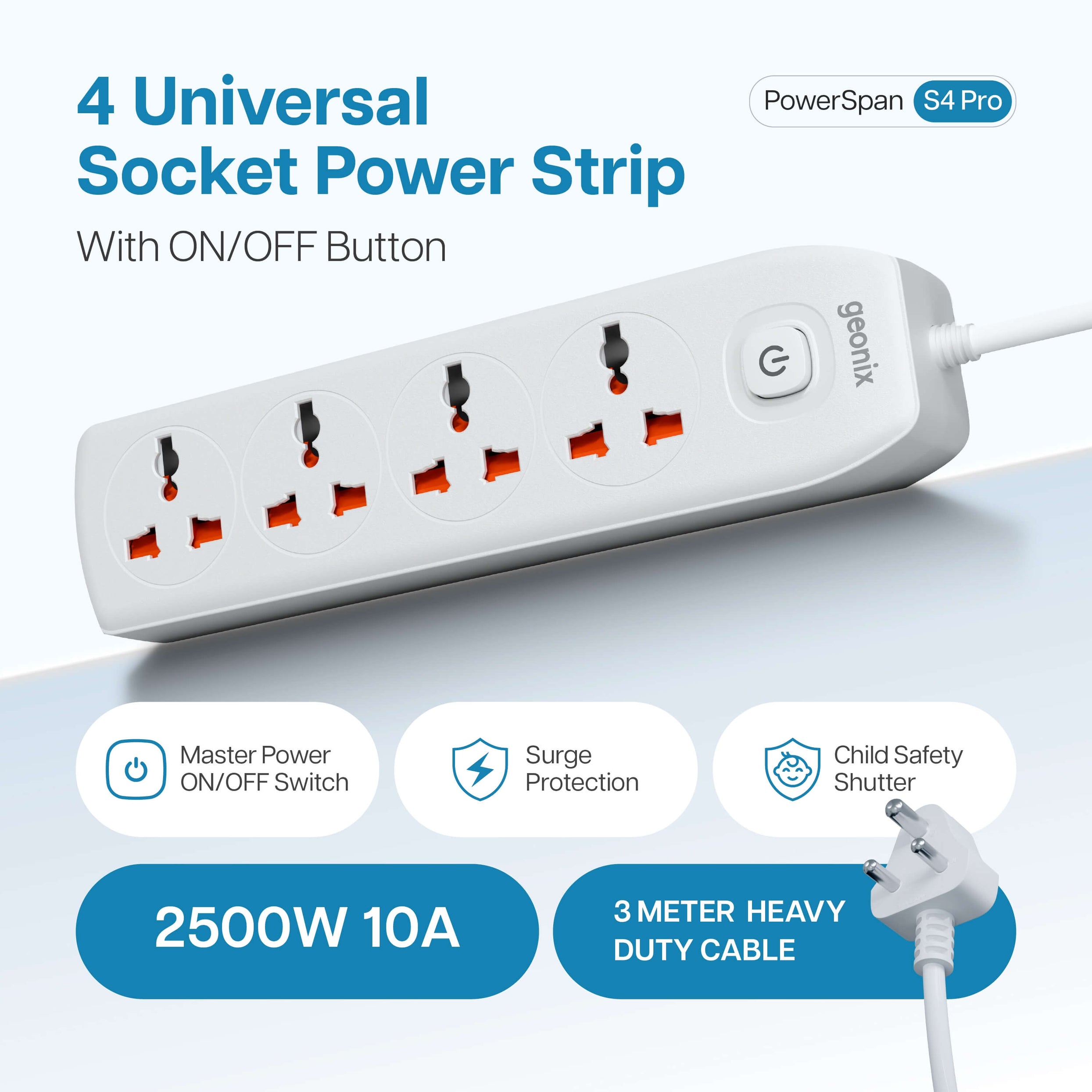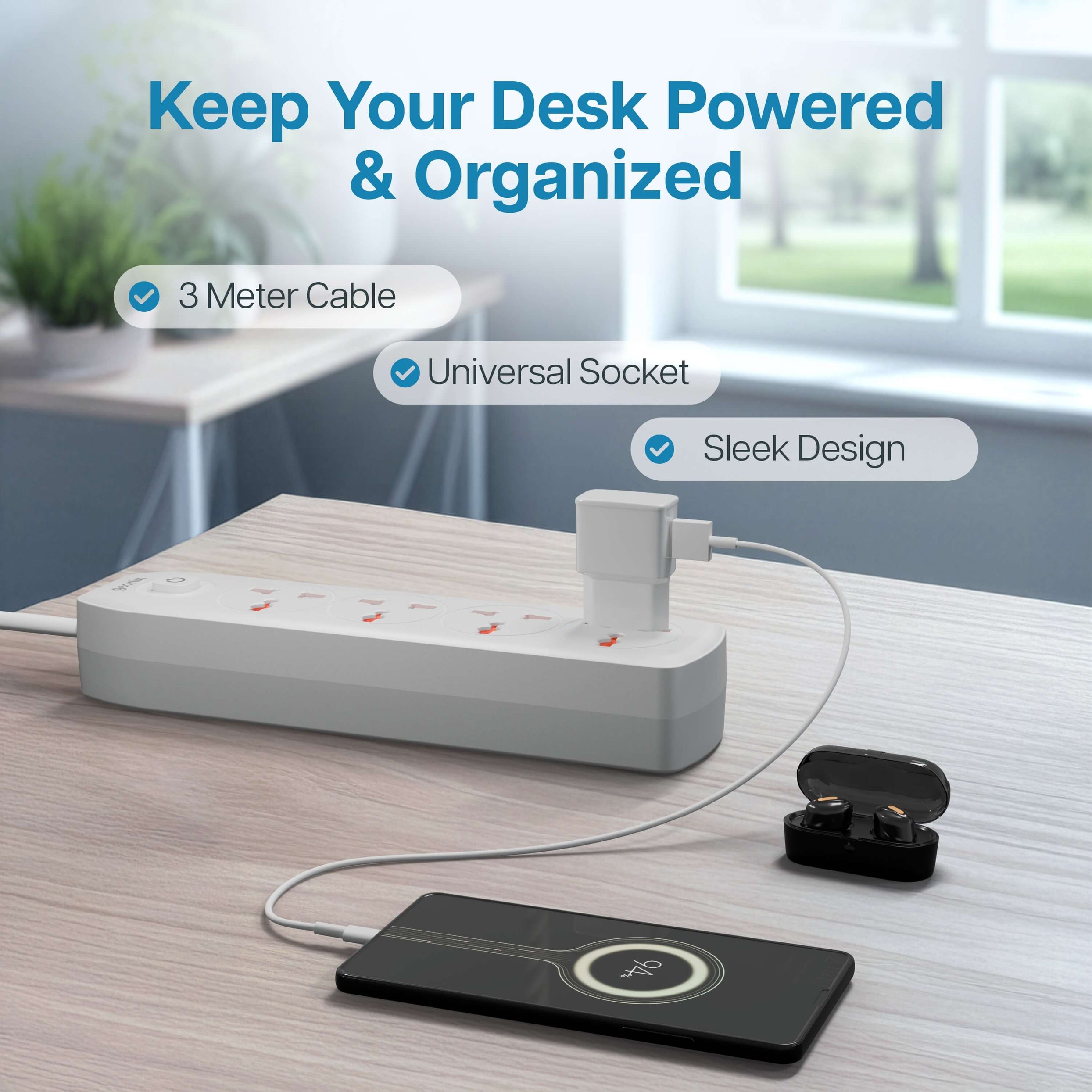 Geonix PowerSpan U3 Extension Board / Power Strip is a smart, all-in-one power and charging solution designed for modern homes and offices. It features 3 universal sockets, 2 USB ports, and 1 Type-C port, allowing you to power and charge multiple devices simultaneously, including smartphones, tablets, laptops, routers, and everyday appliances. With a 1500W power capacity and 6A output, the PowerSpan U3 ensures safe and stable power distribution, supported by a dedicated on/off switch for convenient control. The smart USB and Type-C charging ports are equipped with an intelligent IC that automatically detects connected devices and delivers optimal charging speed. Built with a 3-meter long 100% pure copper cable, it offers excellent conductivity and flexible placement, even for hard-to-reach wall sockets. Its wall-mountable, space-saving design with an LED power indicator makes it ideal for desktops, kitchens, entertainment units, and workstations, combining functionality, safety, and a clean modern look.