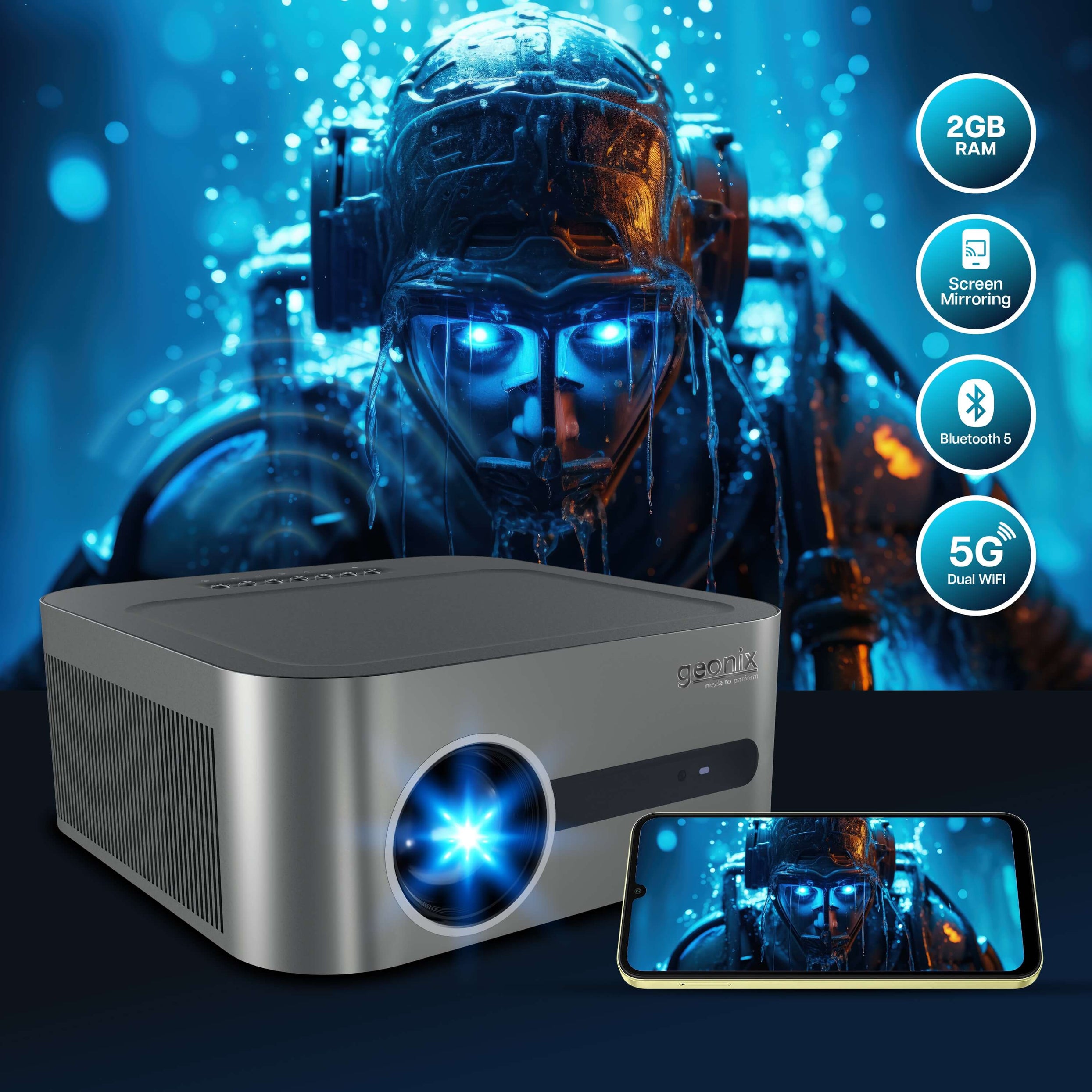 Smart Projector with 8000 Lumen, Auto Focus, Dual Band WiFi, 50,000H Lamp Life Cinema-Style Home Theater.