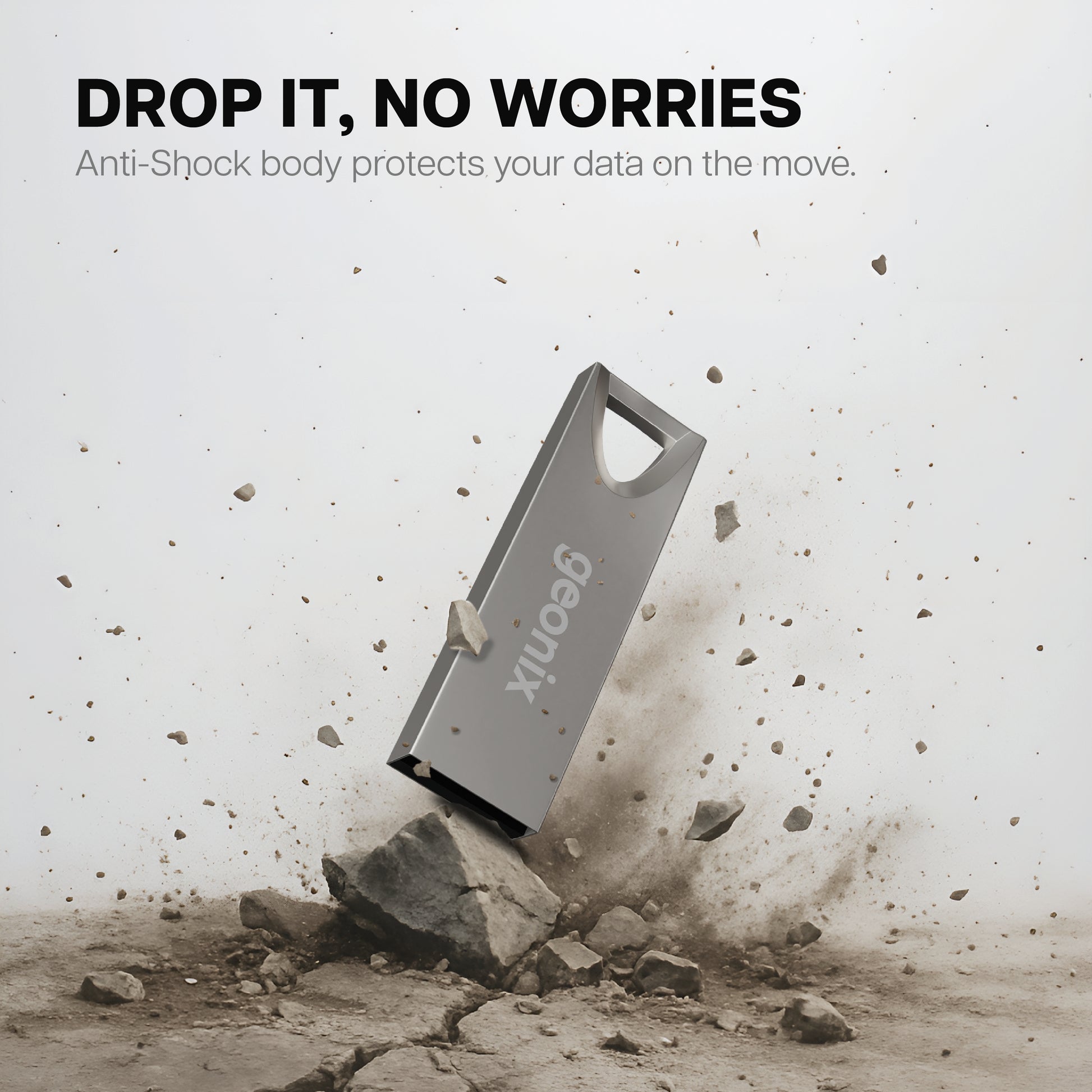The Geonix USB 2.0 Pendrive combines durability, performance, and convenience in a sleek silver design. Crafted with a robust alloy zinc housing and a sandblasted metallic finish, it offers excellent protection against water, dust, and shock, ensuring your data stays safe in all conditions. Its lightweight build and keyring-friendly design make it easy to carry and ideal for on-the-go use. Featuring a USB 2.0 interface with a write speed of up to 20x, it ensures smooth and reliable data transfer for all your important files. Available in storage capacities ranging from 8GB to 128GB, this flash drive combines style, strength, and everyday functionality. Designed for long-lasting performance and backed by a 5-year warranty, the Geonix Pendrive is your perfect companion for safe and effortless data storage .