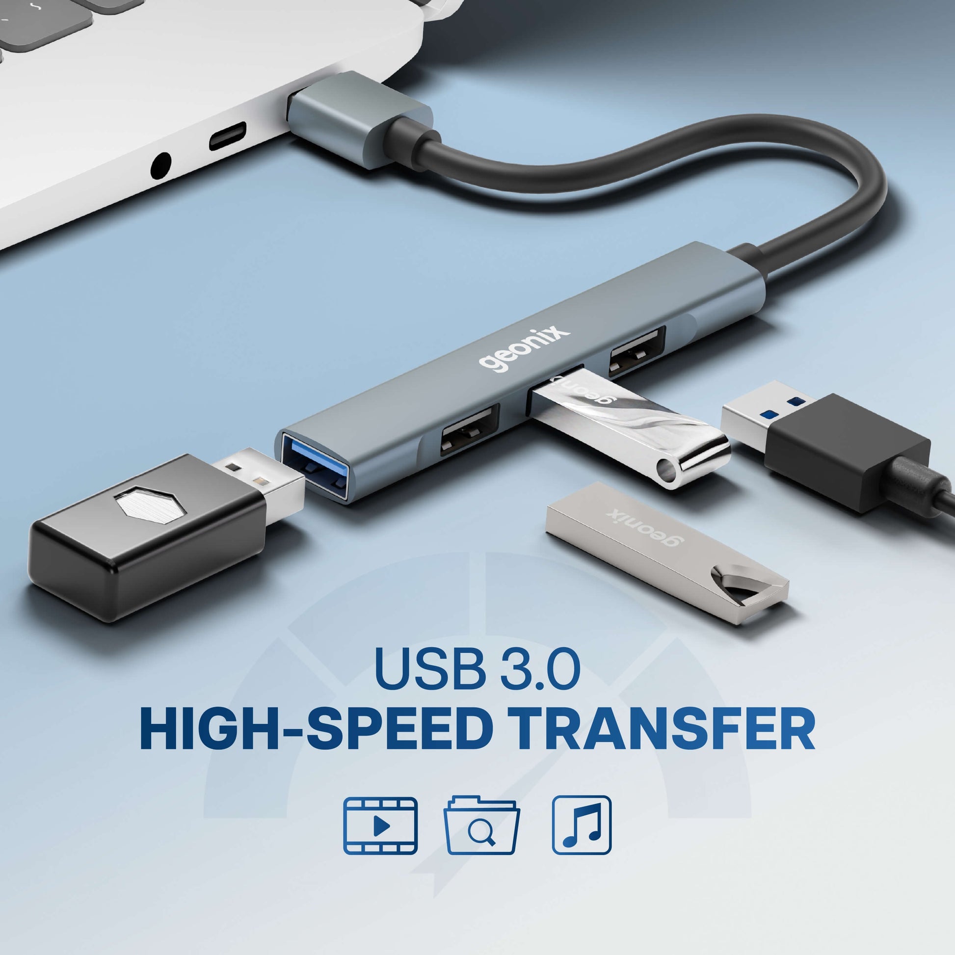 Befit UH4 4-in-1 USB Multiport Hub is a versatile Type-A adapter designed to expand your device connectivity with ease. It transforms a single USB Type-A port into four USB ports, including 1 high-speed USB 3.0 port and 3 USB 2.0 ports, allowing you to connect multiple peripherals such as keyboards, mice, flash drives, and other USB accessories simultaneously. The USB 3.0 port supports super-fast data transfer speeds of up to 5Gbps, making it ideal for quick file transfers, backups, and smooth data handling. Built with a premium aluminum shell, the hub offers enhanced durability, efficient heat dissipation, and a sleek, professional appearance suitable for both office and home setups. Designed for universal compatibility, the Geonix Befit UH4 works seamlessly with laptops, PCs, projectors, smart TVs, and other devices equipped with a USB Type-A port. With its plug-and-play functionality, no drivers or software are required simply plug it in and start using it instantly across Windows, macOS, Linux, and other USB-enabled systems.
